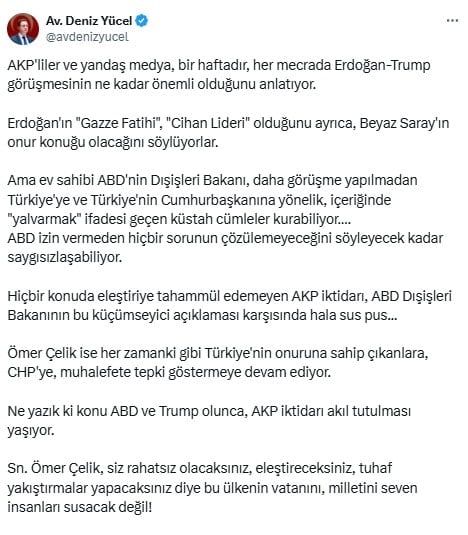 “AKP’liler ve yandaş medya, bir haftadır Erdoğan-Trump görüşmesinin ne kadar önemli olduğunu anlatıyor. Ancak ev sahibi ülkenin Dışişleri Bakanı, daha görüşme gerçekleşmeden Türkiye’ye ve Cumhurbaşkanına karşı ‘yalvarmak’ ifadesini içeren küstah açıklamalarda bulunabiliyor. AKP iktidarı ise bu sözler karşısında hala sus pus.”