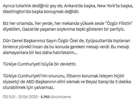 Yücel, CHP’nin Filistin meselesindeki tutumunun net olduğunu vurgulayarak, Genel Başkan Özgür Özel’in ve parti tabanının “soykırıma karşı net bir duruş sergilediğini” söyledi. Açıklamasında şu ifadeye yer verdi: