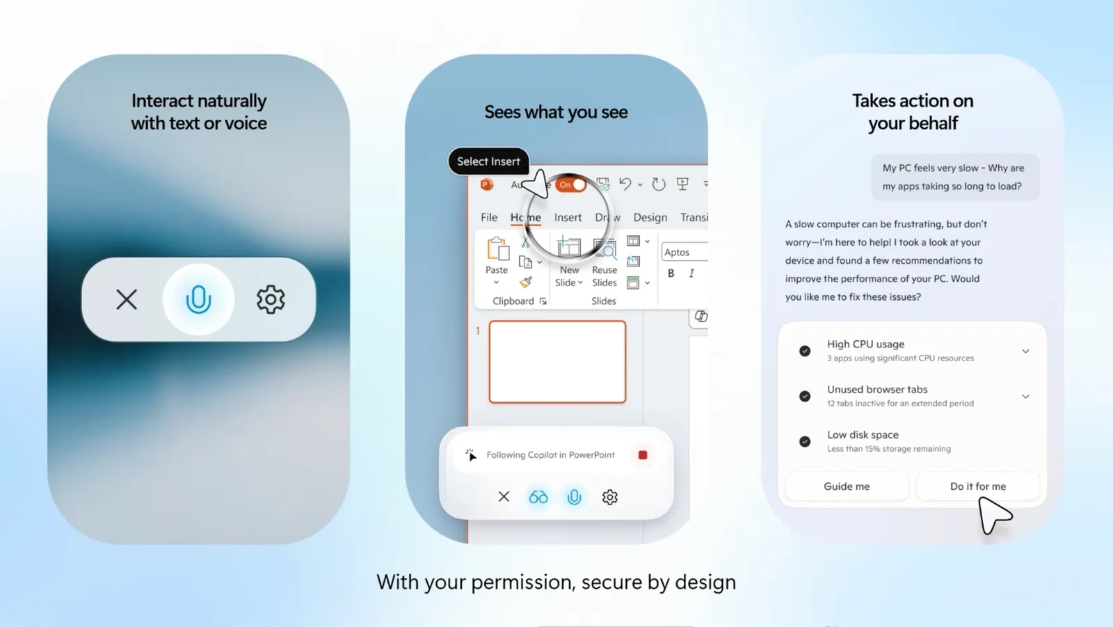 Microsoft, geçmişte sesli asistanı Cortana ile benzer bir dönemden geçmişti ancak bu ve benzeri asistanlar etkileşim anlamında çok sınırlıydı. Ayrıca yetenekleri de oldukça kısıtlıyordu. Copilot sayesinde ise Windows 11’de doğal dilde bir konuşma gerçekleştirilebilecek. Konuşmalar “Goodbye” diyerek veya birkaç saniye sessiz kalarak sonlandırılabiliyor. Microsoft, “Hey, Copilot” özelliğinin tamamen isteğe bağlı olduğunu ve Copilot uygulaması ayarlarından etkinleştirilebileceğini belirtiyor. Copilot Vision, ekranınızı görerek size rehberlik ediyor. Önce Copilot+ PC’lerde bulunan bu özellik, artık NPU (sinirsel işlem birimi) gerektirmeden tüm Windows 11 cihazlarına geliyor. Vision, uygulamalarda hızlı rehberlik, ipuçları ve görev yönlendirmesi sağlıyor. Microsoft, bu özellik için Highlights adını veriyor. Kullanıcı sadece “bana nasıl yapılacağını göster” dediğinde Vision, uygulama içi yönlendirmeler sunuyor. Word, Excel ve PowerPoint gibi uygulamalarda Vision, ekranın dışında kalan içerikleri de analiz edebiliyor.